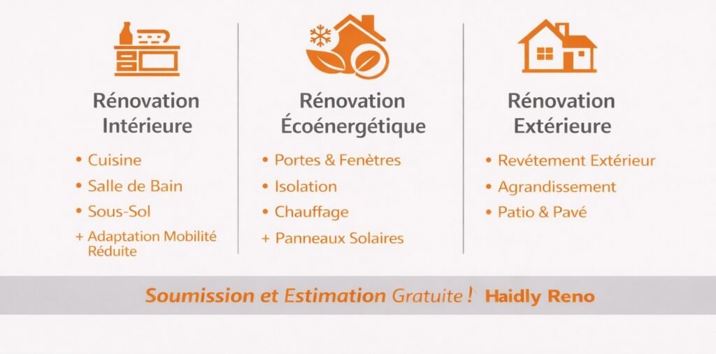 Chez Haidly Reno, nous accompagnons les propriétaires de Québec dans leurs projets de rénovation intérieure, extérieure et écoénergétique avec une approche simple : diagnostic, planification, travaux de qualité et finitions professionnelles.